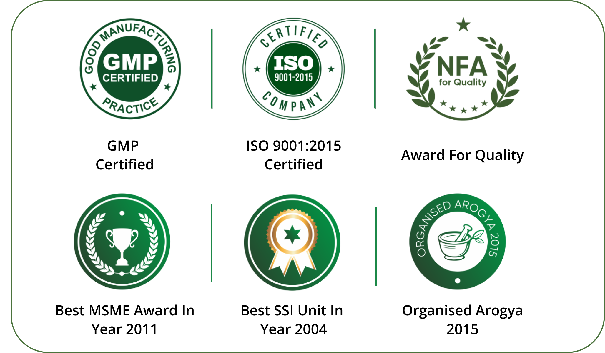 Ancient Recipes processed in scientific and modern technology in state of art manufacturing unitOver 34 years, we've earned a reputation for excellence. GMP certified and ISO 9001:2015 compliant, we're a National Award winner for quality. Including Best MSME Award (2011) and Best SSI Unit (2004). We led Arogya 2015, showcasing industry leadership. Licensed by Ministry of Ayush, Government of India, ensuring the highest quality standards.}