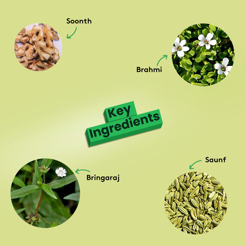 Brahmi, Saunf, Sonth, Nagarmotha, Bringharaj, Chavya, Chitrak, Amaltas Guda, Ppili, Amla, Kailmirch, Shankh Bhasm