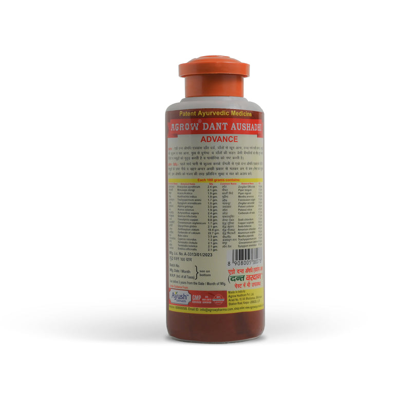 Agrow Dant Aushadhi, an Ayurvedic toothpowder, is a blend of potent 32 herbs essential oils, crafted to treat sensitivity, bad breath, pyorrhea, and provide long-lasting freshness with its minty clove flavor. It is triclosan-free, fluoride-free, and contains no artificial colors, ensuring optimal oral health.
