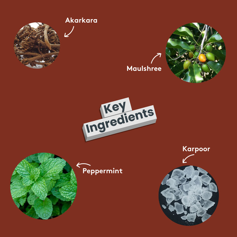Akarkara, Moulshree, Babool, Neem, Ajwain, Clove, Kulnajan, Manjufal, Vach, Latjeera, Patang, Dalchini, Mulethi, Tomar, Nagarmotha, Harad, Behead, Amla, Saunth, Peepal, Kali Irch, Pudina, Saunf, Java Khar,, Sora, Soda, Muktasukti, Sendha Namak, Sudh Tutia, Sudh Suhaga, Sudh Naushadar, Fitkiri,Pepermint, Ajwain Satva, Camphor, Clove Oil